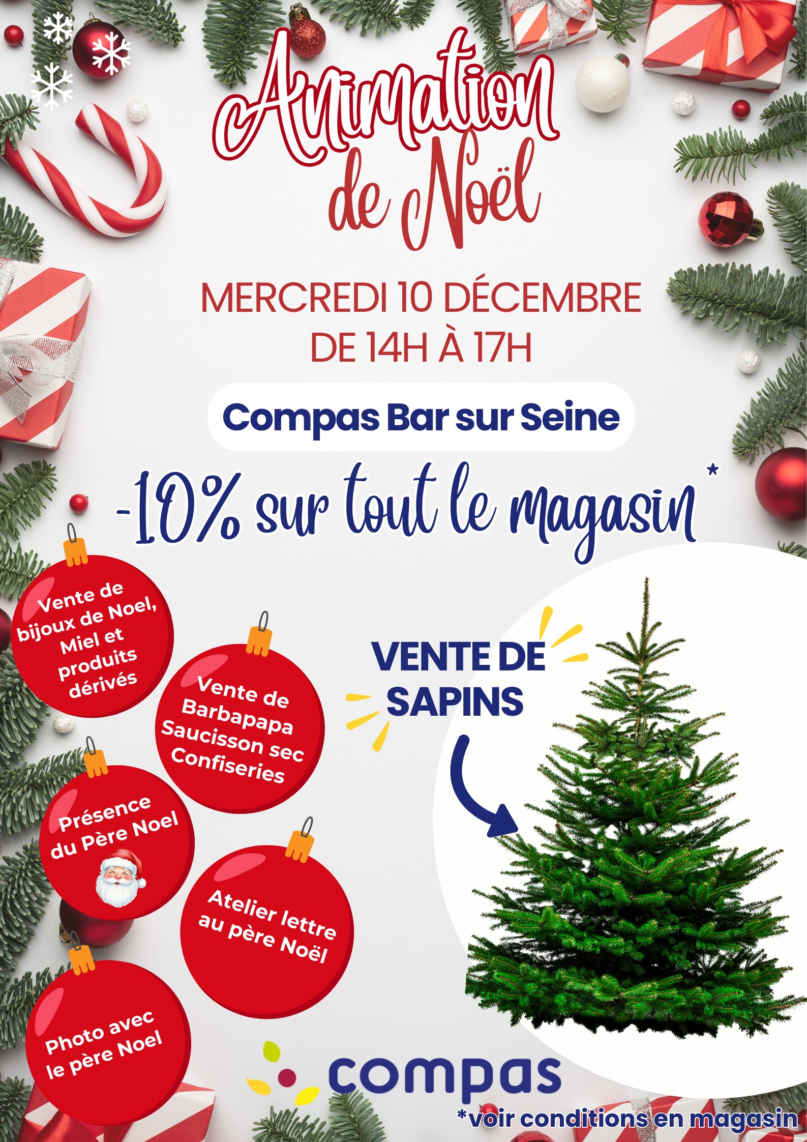 Le magasin Compas de Bar-sur-Seine vous propose des animations de Noël et une promotion sur tout le magasin. Vente de bijoux de Noël, miel et produits dérivés. Vente de barbapapa, saucisson sec et confiseries. Présence du Père Noël, photo avec lui et atelier lettre au père Noël.