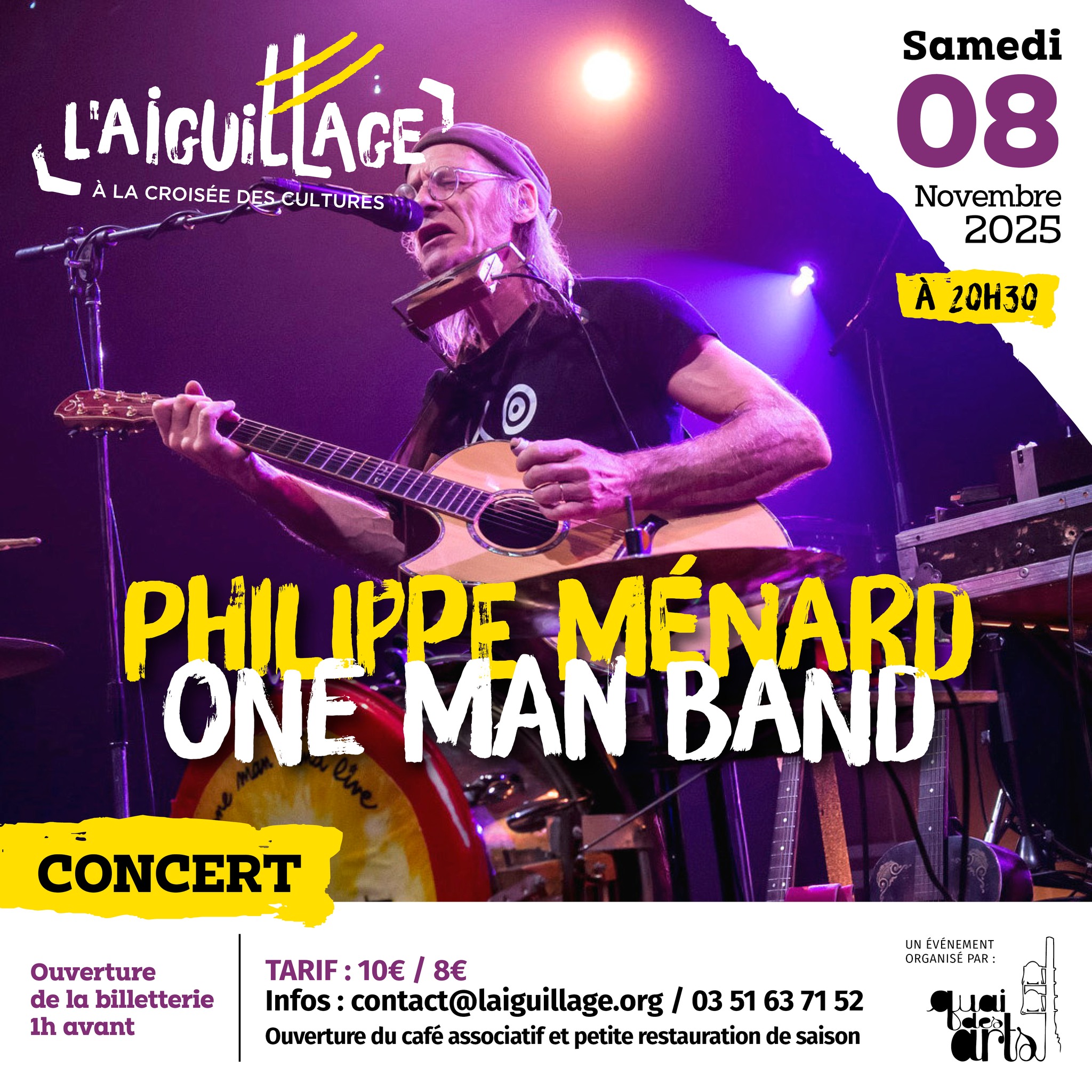 Philippe Ménard est un véritable combo à lui tout seul : Chant, guitare, kit de percussions aux pieds (Grosse caisse, caisse claire, hi-hat, cymbale, tambourin), et harmonica en bandoulière : formule originale et une maîtrise à couper le souffle !