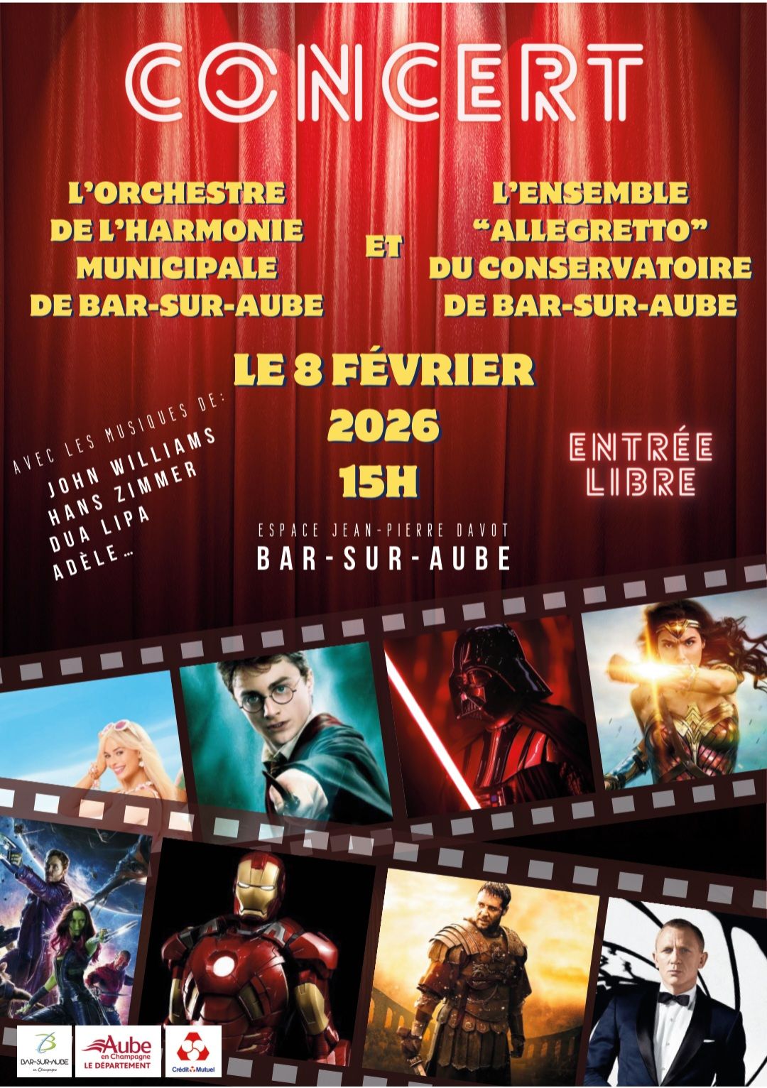 L'orchestre de l'harmonie Bar-sur-Aube et l'ensemble "Allegretto" du conservatoire de musique Bar-sur-Aube interprètera des musiques de films de Hans Zimmer à Adèle.