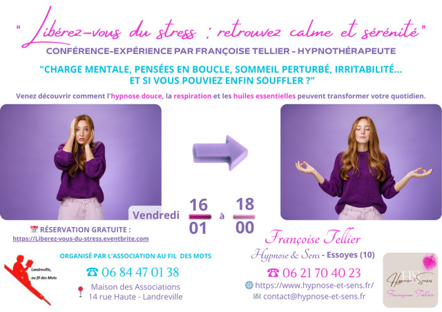 Face à l'augmentation du stress chronique dans notre société (qui touche aujourd'hui un Français sur deux selon les dernières études), l'association « Au fil des Mots » a mis en place depuis plusieurs mois un cycle de conférences sur le thème du stress. Cette conférence-expérience vient clore ce cycle et propose d'explorer les mécanismes du stress et surtout les solutions naturelles pour y faire face.