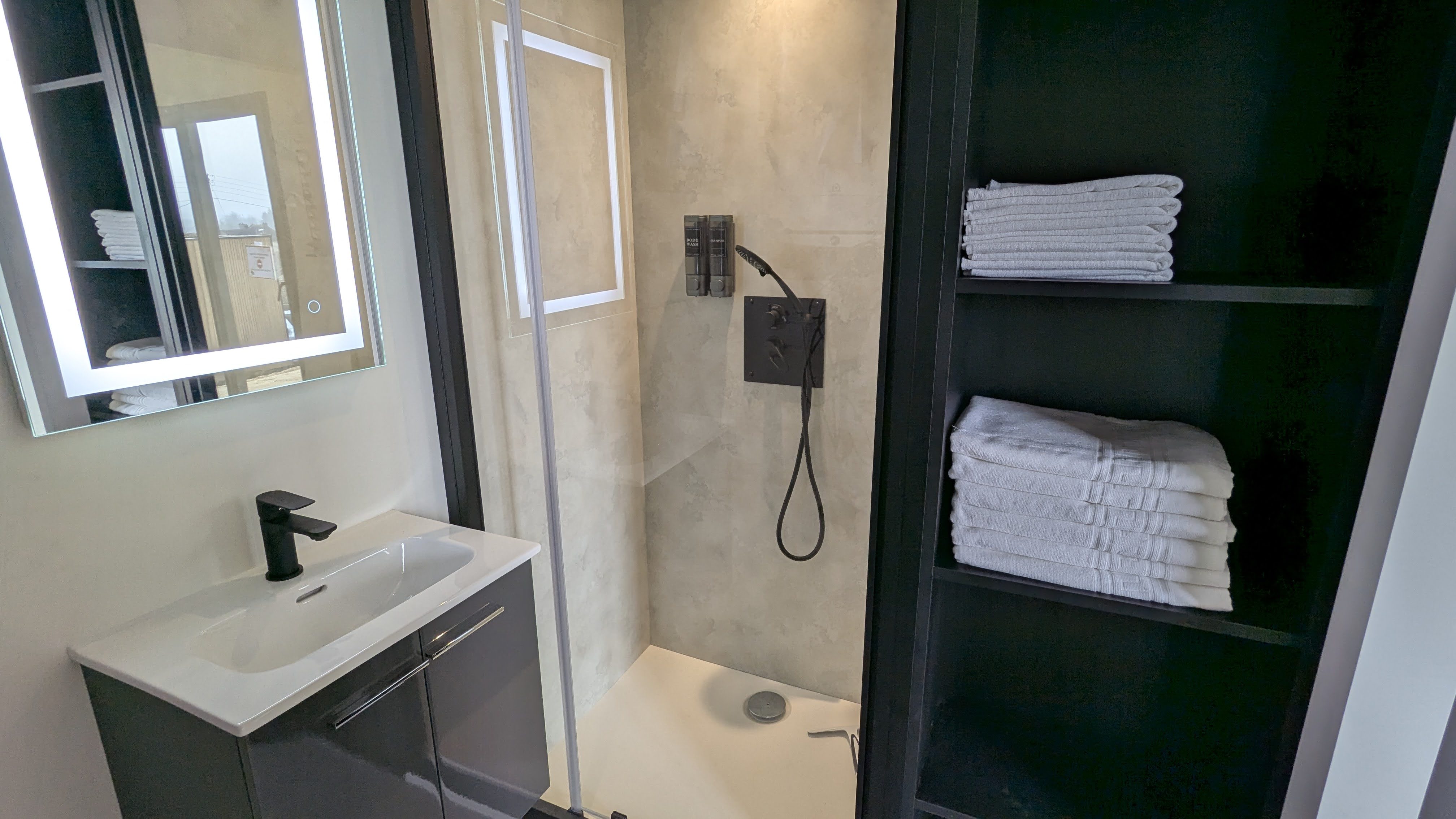 Une salle de bain fonctionnelle: pratique et élégante, pour un confort optimal pendant votre séjour.