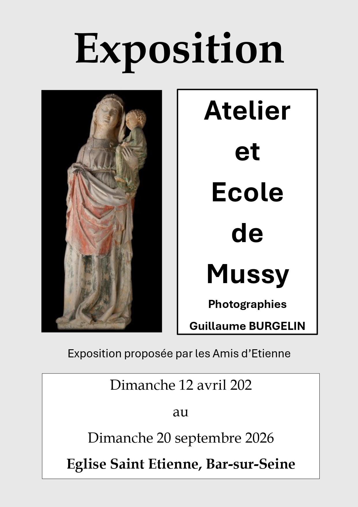 Dans le cadre des Journées Européennes des Métiers d'Art, l’association culturelle Barséquanaise, les Amis d’Etienne, propose une exposition de photographies de Guillaume Burgelin, intitulée « Atelier et École de Mussy » du 12 avril au 20 septembre 2026 à l’église Saint Etienne.