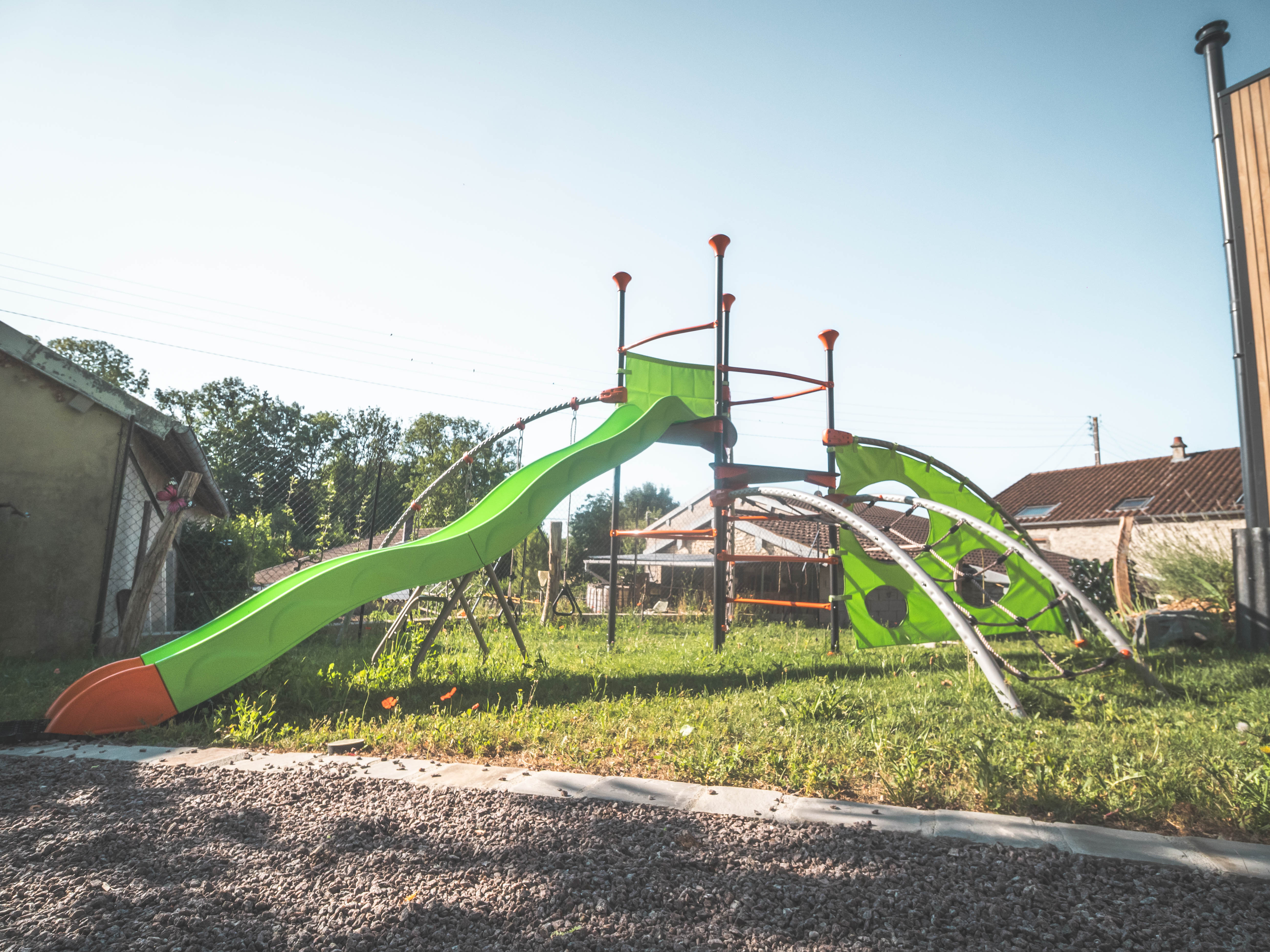 Espace de jeux commun pour les enfants, mini-ferme avec poules et lapins, espace plancha commun.