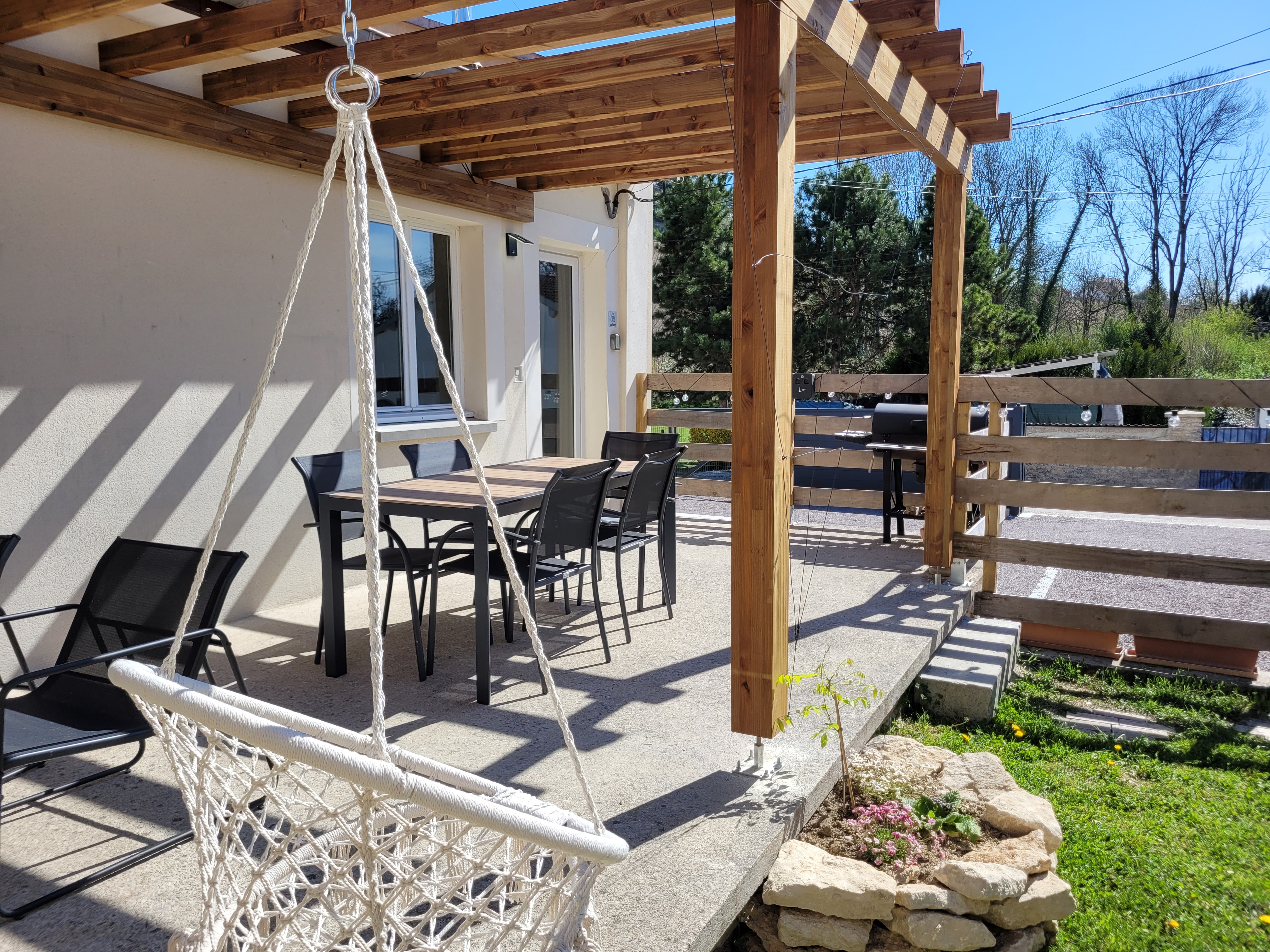 Espace aménagé avec pergola: profitez d’un coin de paradis pour savourer un petit-déjeuner au soleil ou une coupe de champagne au coucher du soleil, tout en admirant la beauté de la nature environnante.